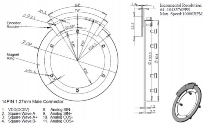 產(chǎn)品介紹嵌入式空心編碼器EI105H70 產(chǎn)品介紹: EI105H70是一款空心的內(nèi)嵌式增量磁性旋轉(zhuǎn)編碼器,無外殼結(jié)構(gòu),PCB外徑105mm,內(nèi)徑70mm,易于設(shè)備的內(nèi)部安裝,與客戶設(shè)備形成一個整體,板載的讀透可以感應(yīng)到磁場強度,因而可以測量出旋轉(zhuǎn)角度及轉(zhuǎn)速,分辨率為2^12~20位PPR可選。 技術(shù)參數(shù):