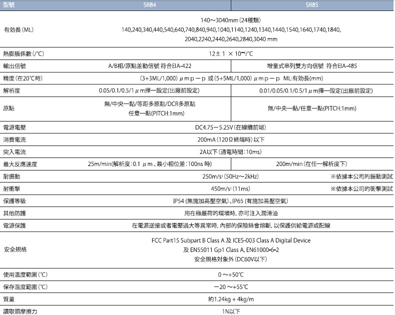 產(chǎn)品介紹簡單介紹: 多原點絕對式磁尺SR84/SR85:適合需要高精度定位工作機械的高剛性中型磁性尺,輸出信號為A/B相/原點差動信號(符合EIA-422)及增量式串列雙方向信號(符合EIA-485);適用工控系統(tǒng):FANUC、三菱電機、松下 產(chǎn)品特性: 高剛性多原點絕對式磁尺SR84/SR85:適合需要高精度定位工作機械的高剛性中型磁性尺,輸出信號為A/B相/原點差動信號(符合EIA-422)及絕對式串列雙方向信號(符合EIA-485);精度±(1.5+1.5L/1000)μm,測量長度:140-3040mm,分辨率0.01μm,響應(yīng)速度200m/min,讀數(shù)頭摩擦力1N以下。適用工控系統(tǒng):FANUC、三菱電機、松下。