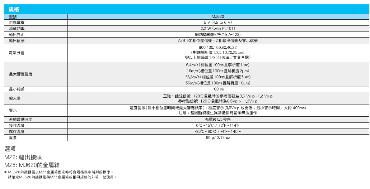 MJ620內(nèi)置接收器, 可從差分線路驅(qū)動器產(chǎn)生A/B相90°相位差信號, AZ相位輸出信號及警示信號; 細(xì)分?jǐn)?shù)最大800; 響應(yīng)速度最大56m/s; 最大相位差100ns; 配用產(chǎn)品:PL101,MZ2,MZ5,SL700。 品特性: 產(chǎn)品特性: MJ620內(nèi)置接收器 適用于各種工廠作業(yè)環(huán)境,耐油水灰塵,抗震動沖擊能力強(qiáng)