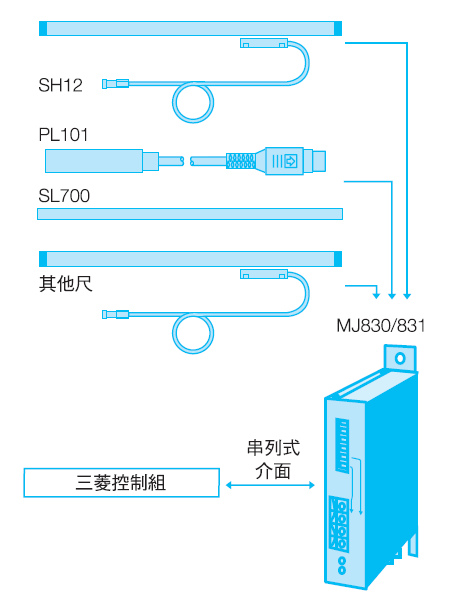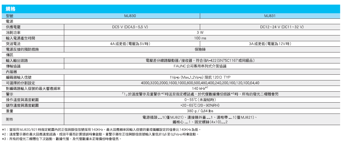 產品介紹簡單介紹: 用于三菱MR-J2超級系列放大器的內插器MJ830/MJ831 信號轉換器放大器MJ830/MJ831; 允許直流補償、增益補償、相位差補償, 配用產品:PL101,SH12及通用類似輸出編碼器。 適用于三菱公司專用串列式介面協(xié)議。特性: 產品特性: 用于三菱MR-J2超級系列放大器的內插器MJ830/MJ831 輸入阻抗 Input impedance:120 Ω 差動輸入電壓 voltage differential input:1 Vp-p 最高響應頻率Max. response frequency:140 kHz for any number of divisions selected 電源 Power supply:MJ830 DC 5V(4.5-5.5V);MJ831 DC 12V-24V(11V-32V)